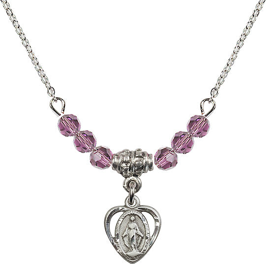 This 18-Inch Rhodium Plated Necklace comes with 4mm Light Amethyst Beads and a Miraculous charm and features the Catholic Shop.com money-back guarantee.