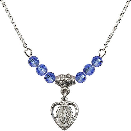 This 18-Inch Rhodium Plated Necklace comes with 4mm Sapphire Beads and a Miraculous charm and features the Catholic Shop.com money-back guarantee.