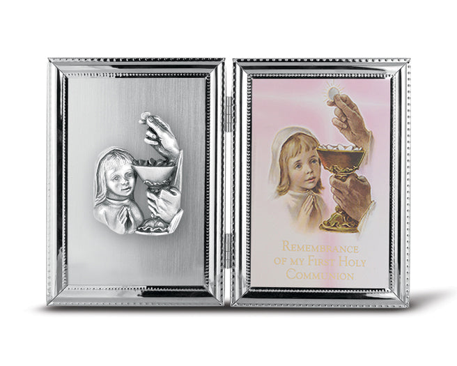 Double Hinged Communion Remembrance Photo Frame. All Silver Plated Metal Framework with a Genuine Fine Pewter Figure on a Satin Metal Sheet. Holds a 4-inch x 6-inch Photo Under Glass. Gift Boxed 5-inch x 7-inch (10.5-inch x 7-inch Open). This Silver Plate Communion Girl Frame features the Catholic Shop.commoney-back guarantee.