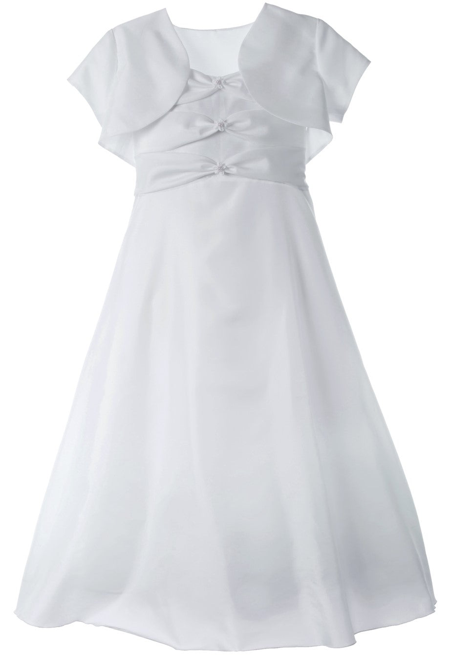 This beautiful two piece a-line taffeta dress with bow trim bodice, separate jacket and adjustable tie back comes from New York City-based clothing line Lauren Madison. Catholic Shop.comis pleased to offer high-end First Communion dresses and other items that will help make your child's big day even more special.
