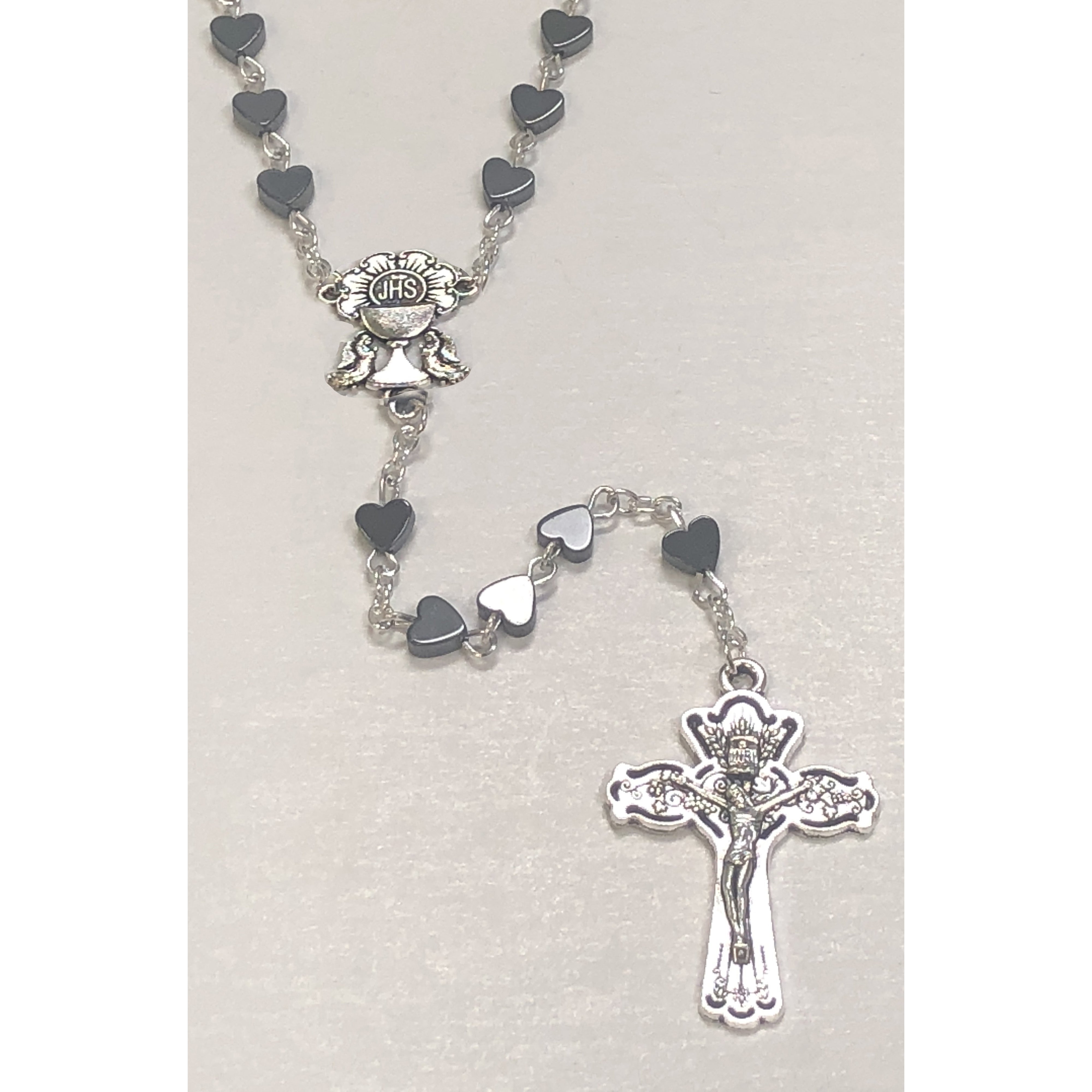 6mm First Communion Heart Shaped Black Hematite Rosary Silver Toned Chalice Center