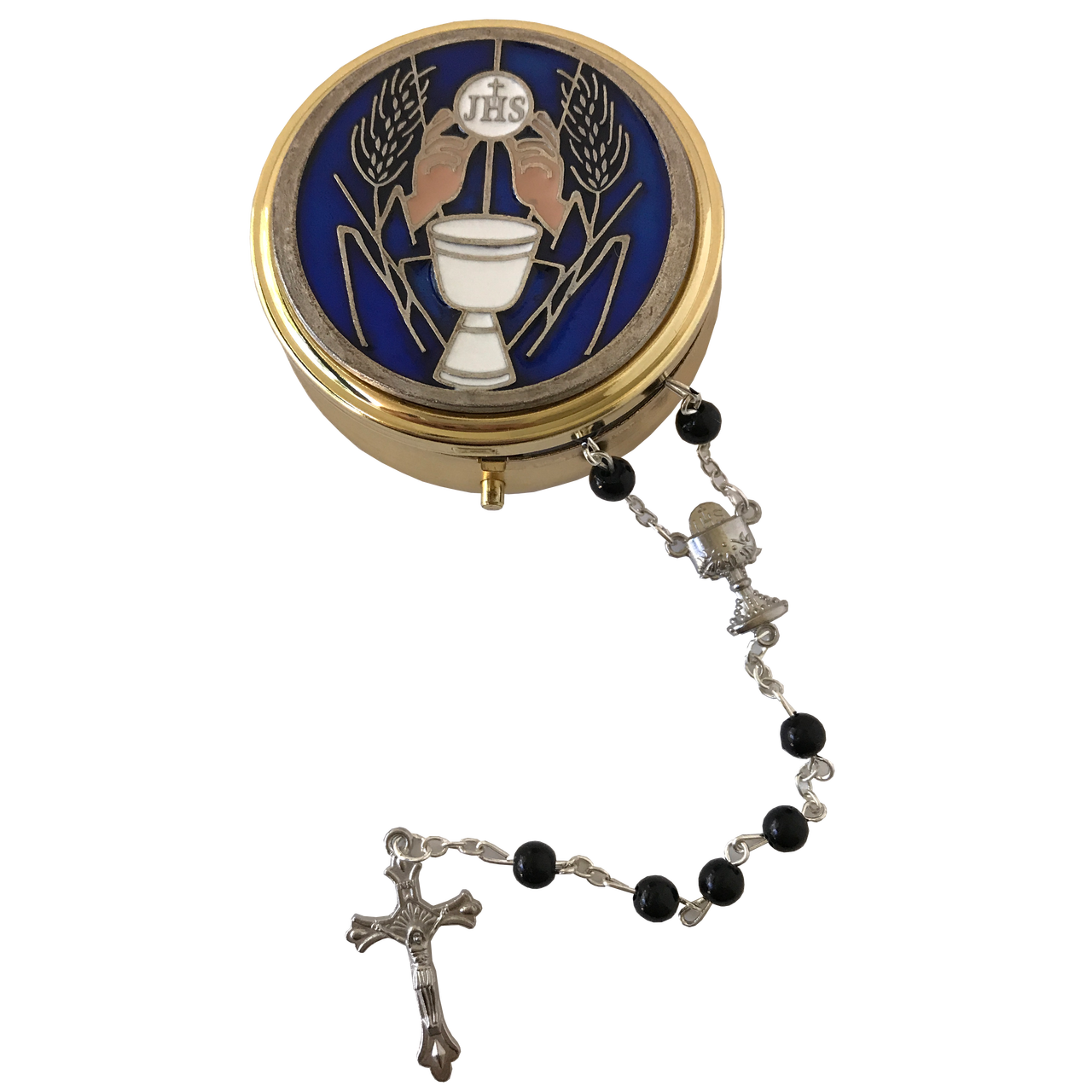 Gold Tone Rosary case with Blue and White Enamel Communion Image
