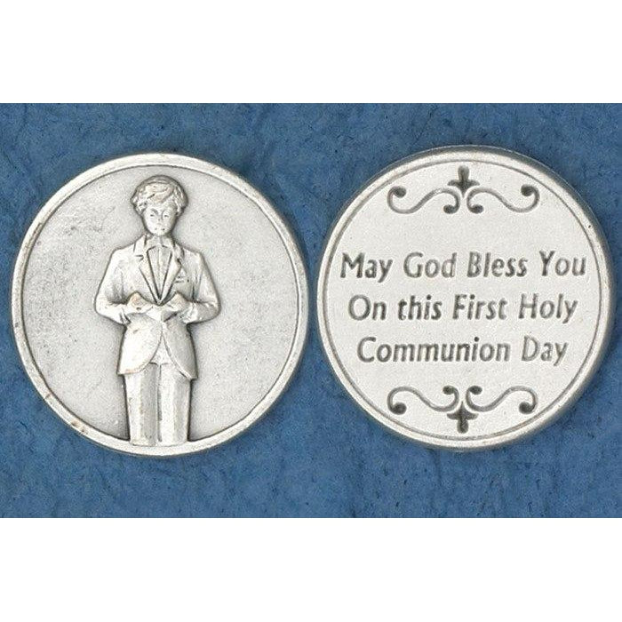 These silver-toned First Communion pocket tokens from Lumen Mundi feature a reverent design celebrating a young boy's special day receiving Jesus in the Eucharist for the first time. Crafted in Italy with fine attention to detail, each token serves as a meaningful keepsake that fits perfectly in a pocket or small pouch, allowing First Communicants to carry a reminder of this sacred milestone wherever they go.
