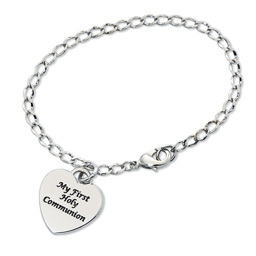 Sterling Silver 6 1/2" My 1 St Holy Communio bracelet is a beautiful way to commemorate a child's first Holy Communion. Crafted from high-quality sterling silver and featuring a rhodium-plated charm, this bracelet serves as a cherished keepsake that inspires faith and devotion. Presented in an elegant white leather box, it makes an ideal gift for this significant milestone in a young Catholic's life.