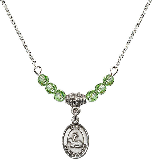 Our 18" Rhodium Plated Necklace with 4mm Peridot Crystal Beads featuring a Sterling Silver First Reconciliation Medal. is proudly manufactured in the USA.