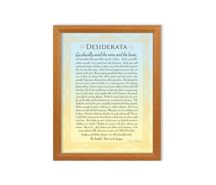 Desiderata, the timeless poem by Max Ehrman, is presented here in a high-gloss, full color print. The print measures 8.5 inches by 11 inches. It's available unframed, or in several framing options: