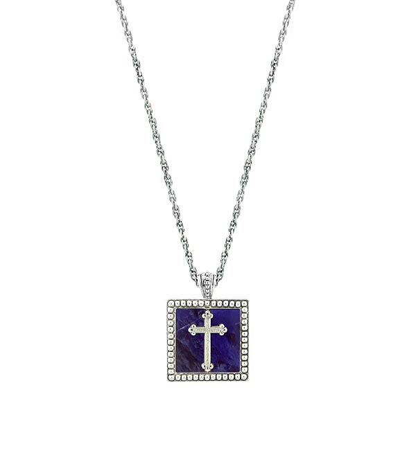 Silver-Tone Sodalite Square w/Cross Pendant