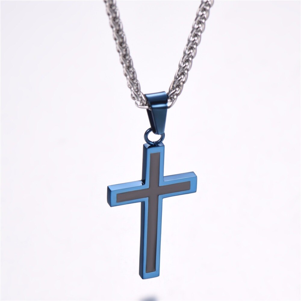 This simple yet stylish cross pendant measures 2 inches long (50 MM) and 0.8 inches wide. The necklace is 20 inches long but extendable to 22 inches. Made of Blue Ion-Plated 316L Stainless Steel, this jewelry by Apostle Gear is designed to withstand rugged use without tarnishing.