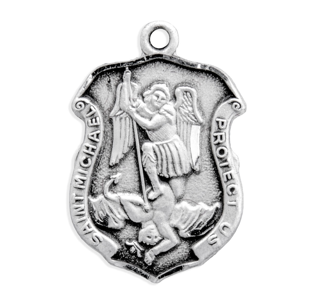 9/16-inch Sterling Silver St. Michael Medal Made in the USA. The Badge Shaped Medal is adorned with a Depiction of St. Michael Slaying Lucifer. A 18-inch Rhodium Plated Curb Chain is Included with a Deluxe Velour Gift Box.