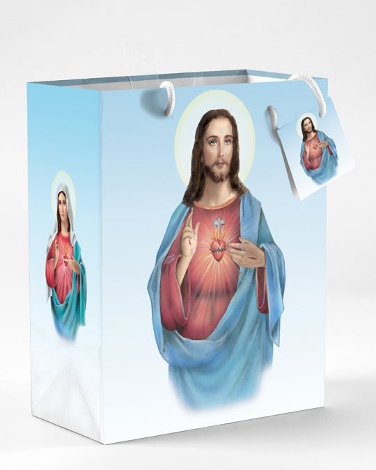 Present your cherished religious gifts in style with our Large Twin Hearts Gift Bag with Gift Tissue. Measuring 9.75 inches by 7.75 inches, this beautifully designed bag features the sacred image of the Twin Hearts of Jesus and Mary, reminding the recipient of their deep love and mercy. Imported from Italy, this gift bag is perfect for any occasion, from Baptisms to First Communions, or as an evangelizing tool for sharing your faith.