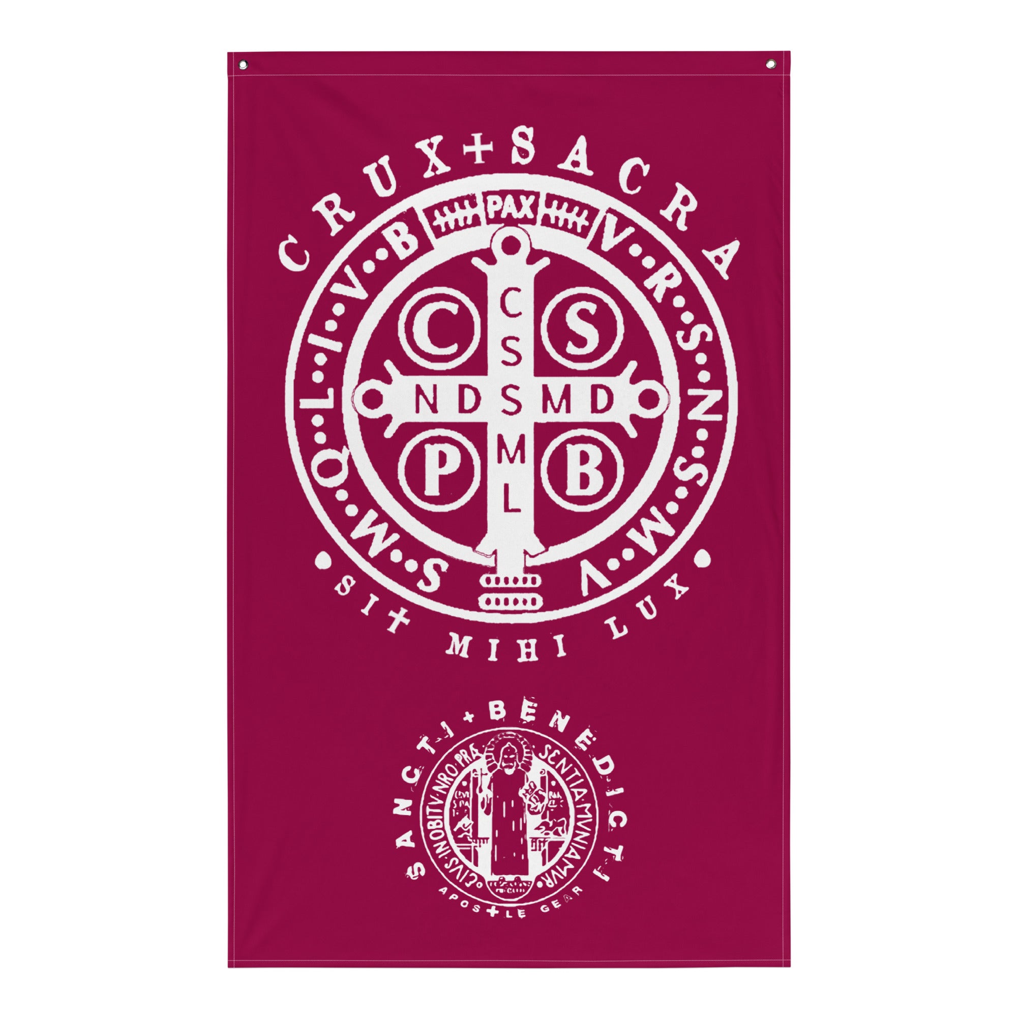 Latin text around the medal designs of the St. Benedict Medal Flag and Banner read:
