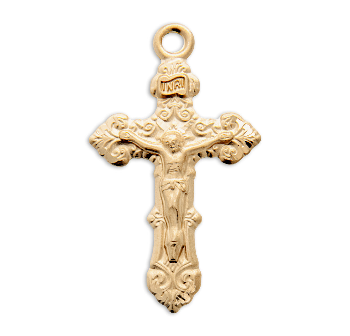 Discover spiritual elegance with our 7/8-inch Gold Over Sterling Silver Crucifix with 18-inch Chain. Crafted in the USA, this beautifully designed crucifix serves as a daily reminder of Christ's love and sacrifice. The radiant gold over sterling silver finish not only enhances its beauty but also strengthens your faith as you wear it close to your heart. Perfect for gifts, this crucifix inspires devotion and connection to the divine, making it an ideal choice for First Communions, Confirmations, or special occasions.