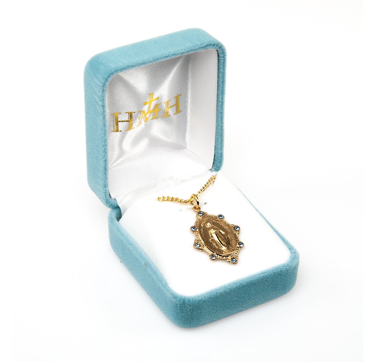 1-inch Gold over Sterling Silver Miraculous Medal, made in the USA. The Traditional Shape with Eight Finest Austrian Crystal Light Sapphire Set Crystal Embellished Rays of Light around Fancy Border is Adorned with finely detailed Blessed Mother Mary with rays coming out of her extended hands. The Reverse Side of the Medal Portrays an "M" with a Cross on the top and the "Sacred Hearts" underneath surrounded by Twelve Stars.