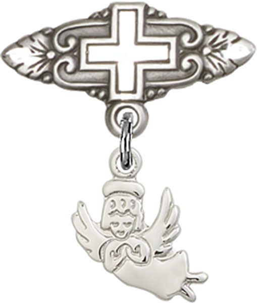 Sterling Silver Baby Badge with Guardian Angel Charm and Badge Pin With Cross