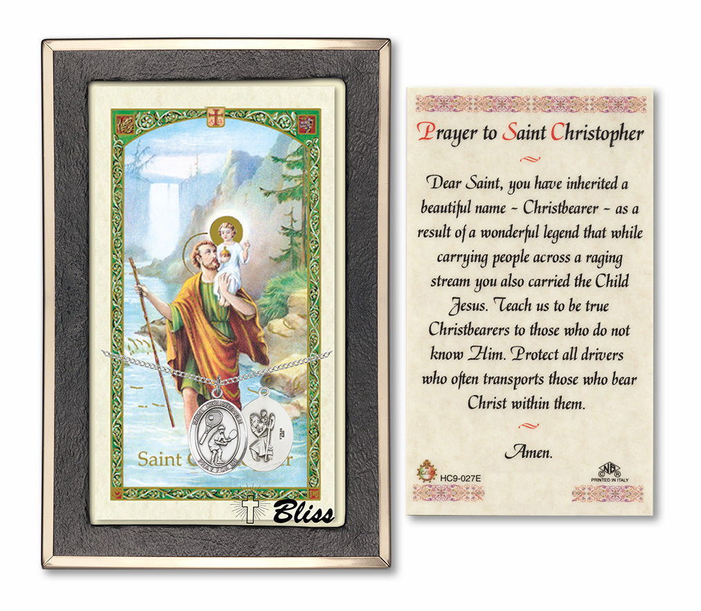 The medium-sized Saint Christopher/Tennis Medal with Prayer Card will arrive in a deluxe jewelry box, ready to wear or give as a gift.