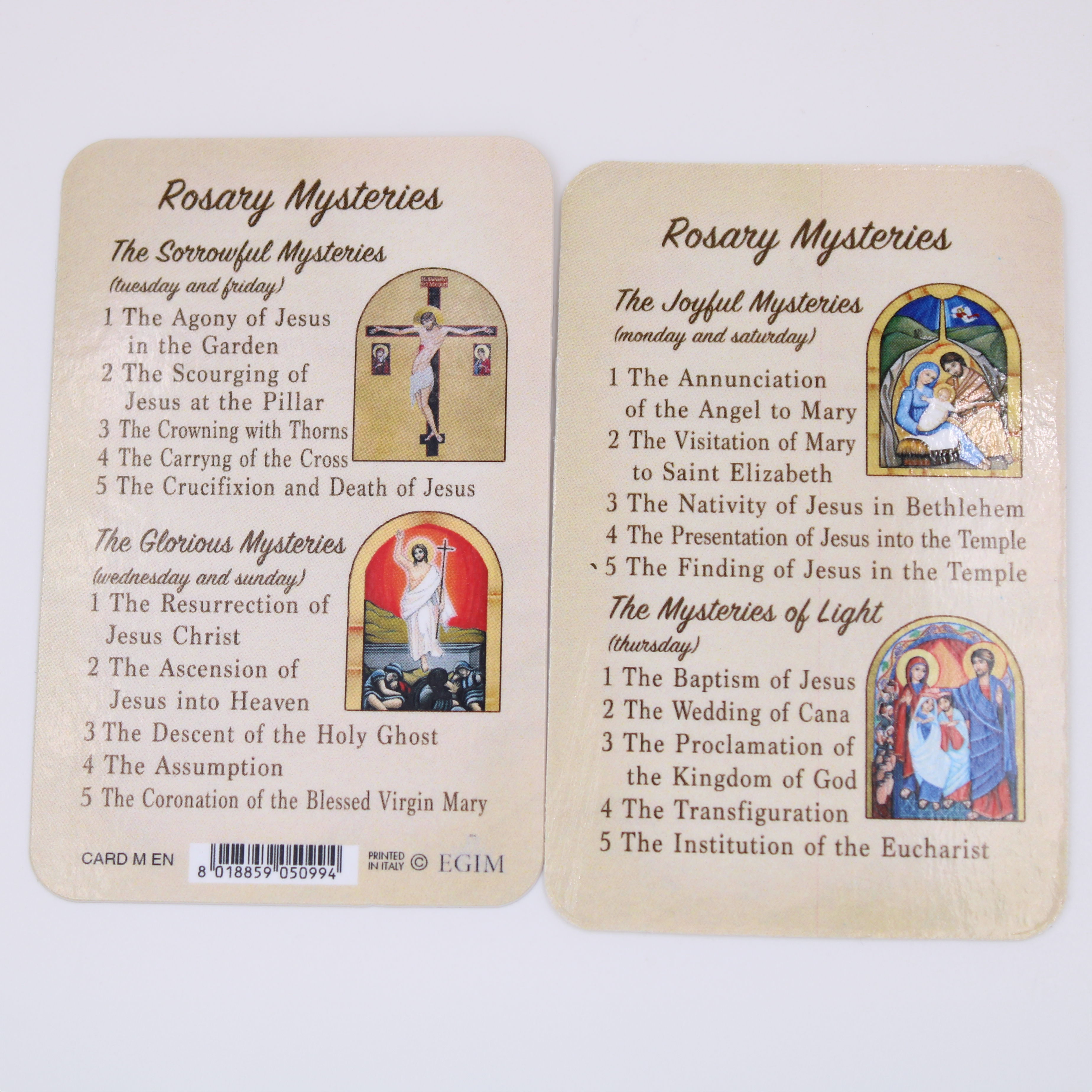This pack of 25 durable PVC cards provides a convenient reference for all four Mysteries of the Rosary—Joyful, Luminous, Sorrowful, and Glorious. Each card features clear listings of the mysteries, making them perfect for parish groups, religious education classes, RCIA programs, or prayer groups learning to pray the Rosary. The waterproof, tear-resistant PVC material ensures these cards will last through years of use and devotion.