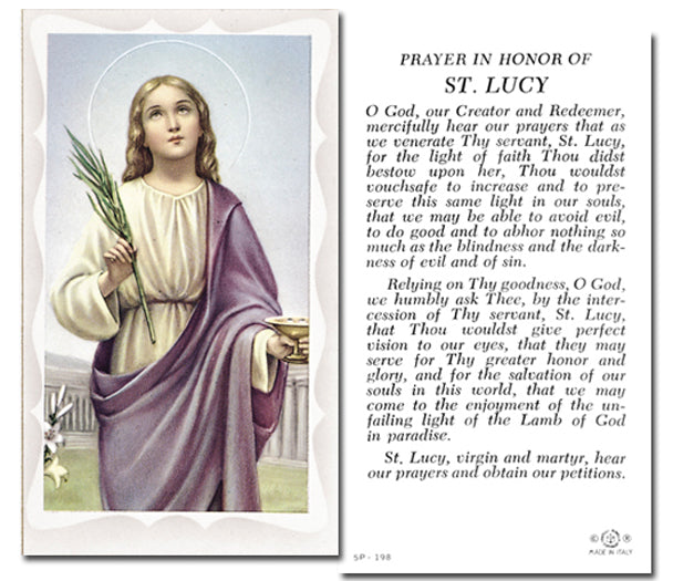 This bulk pack is perfect for parishes, prayer groups, or personal devotion, allowing you to share St. Lucy's intercession with others. Each card includes a prayer to St. Lucy, encouraging daily reflection and connection with the divine. Elevate your spiritual journey and inspire those around you with these cherished holy cards.