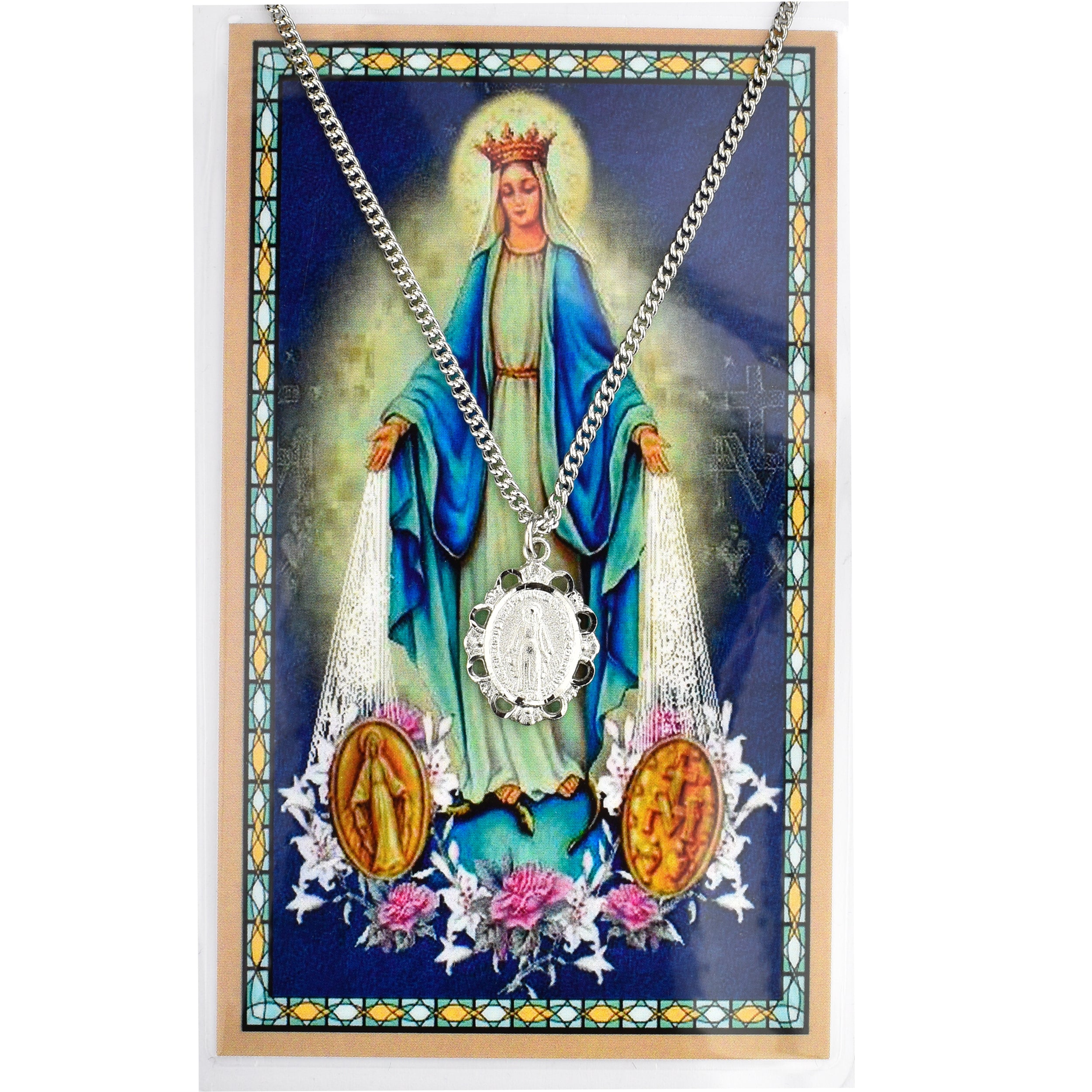 This Miraculous Prayer Card Set features a premium holy card and a devotional medal necklace with a chain.