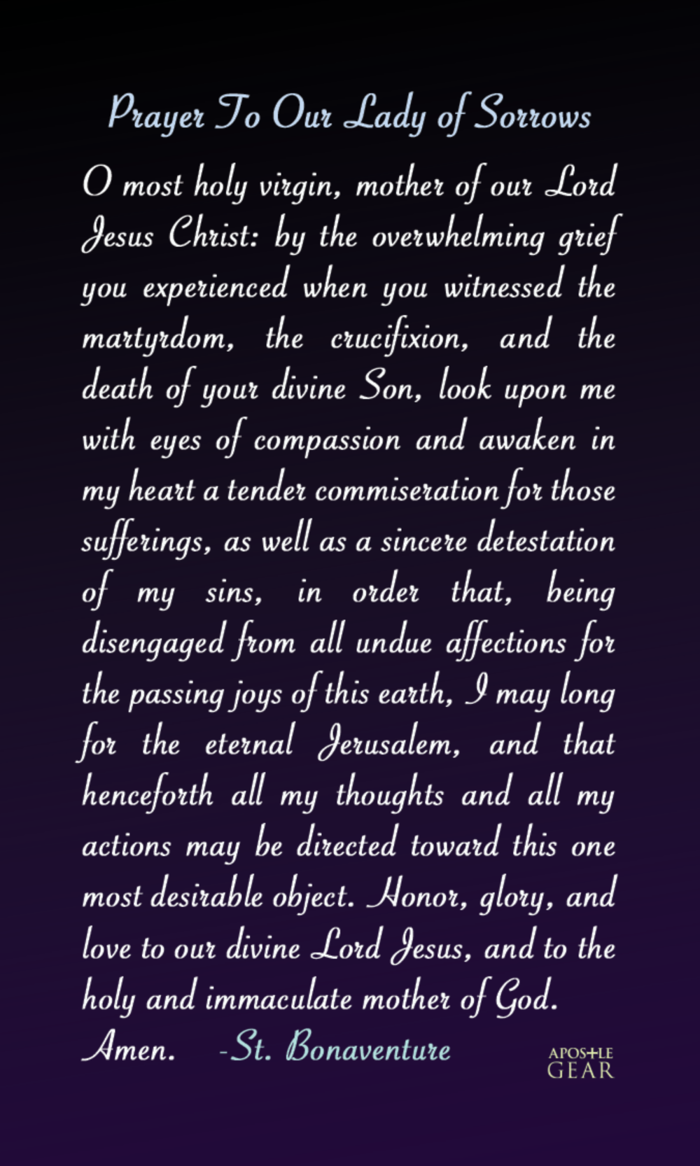On the back of this holy card is the beloved Prayer To Our Lady of Sorrows. Designed in-house by the Apostle Gear graphic arts team! You won't find a more unique and beautiful holy card anywhere.