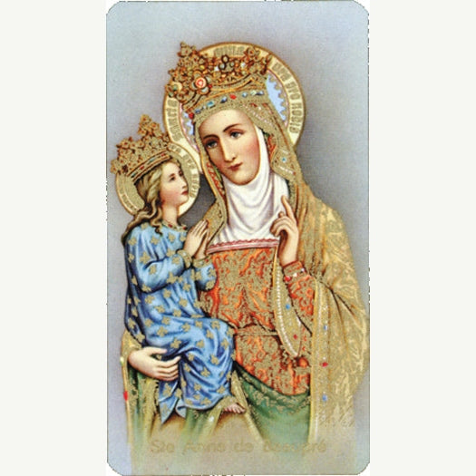 Embrace the grace of St. Anne with our 100-Pack - St. Anne Debeaupre Holy Card. Each beautifully crafted card measures 2 inches x 4 inches and features elegant gold edges, making them perfect for sharing your faith. This bulk pack is ideal for parishes, schools, or personal use, providing a meaningful way to inspire others and keep the spirit of St. Anne alive in your community.