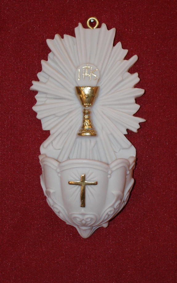 This First Communion Font White Alabaster 5-inch is from the renowned Goldscheider collection.