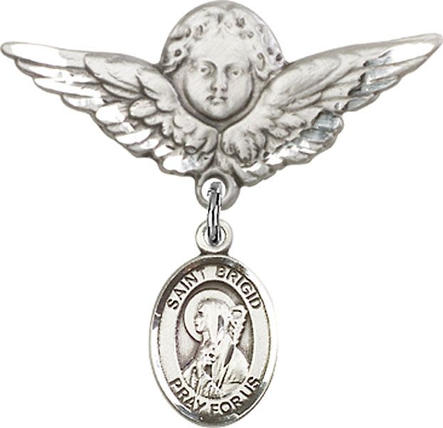 Sterling Silver Baby Badge with St. Brigid of Ireland Charm and Large Angel w/Wings Badge Pin
