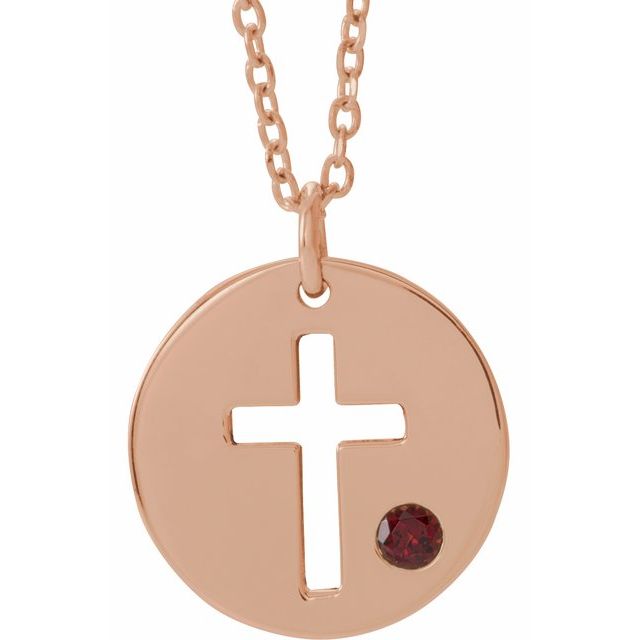 14K Rose Garnet Pierced Cross Disc 16-18" Necklace