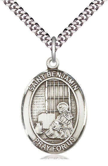Our Pewter Saint Benjamin Pendant on an 24-inch Light Rhodium Heavy Curb Chain is proudly manufactured in the USA.