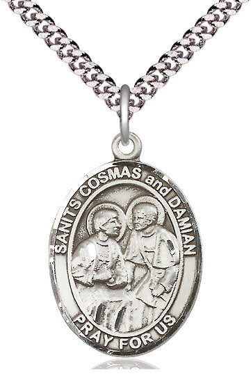 Our Pewter Saints Cosmas and Damian Pendant on an 24-inch Light Rhodium Heavy Curb Chain is proudly manufactured in the USA.