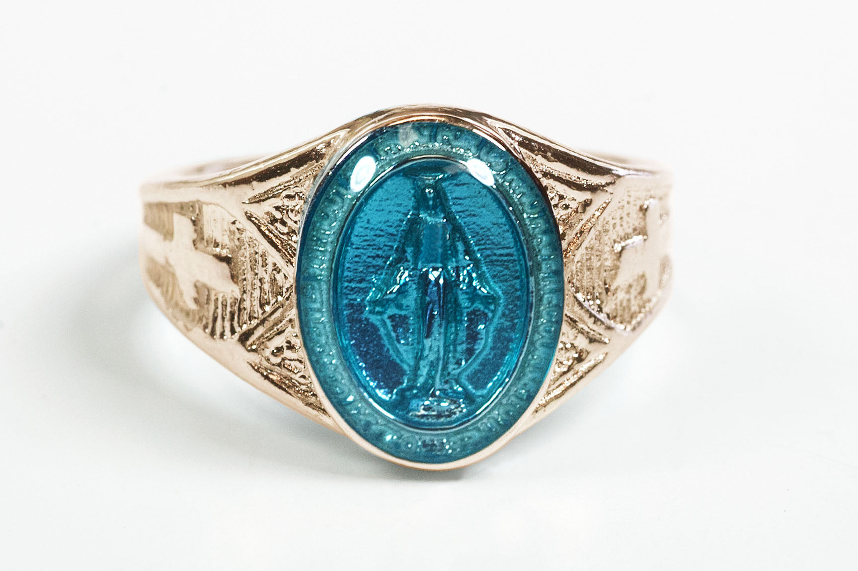 Our 14kt Gold Miraculous Medal Ring with Blue Epoxy Accent is proudly manufactured in the USA.