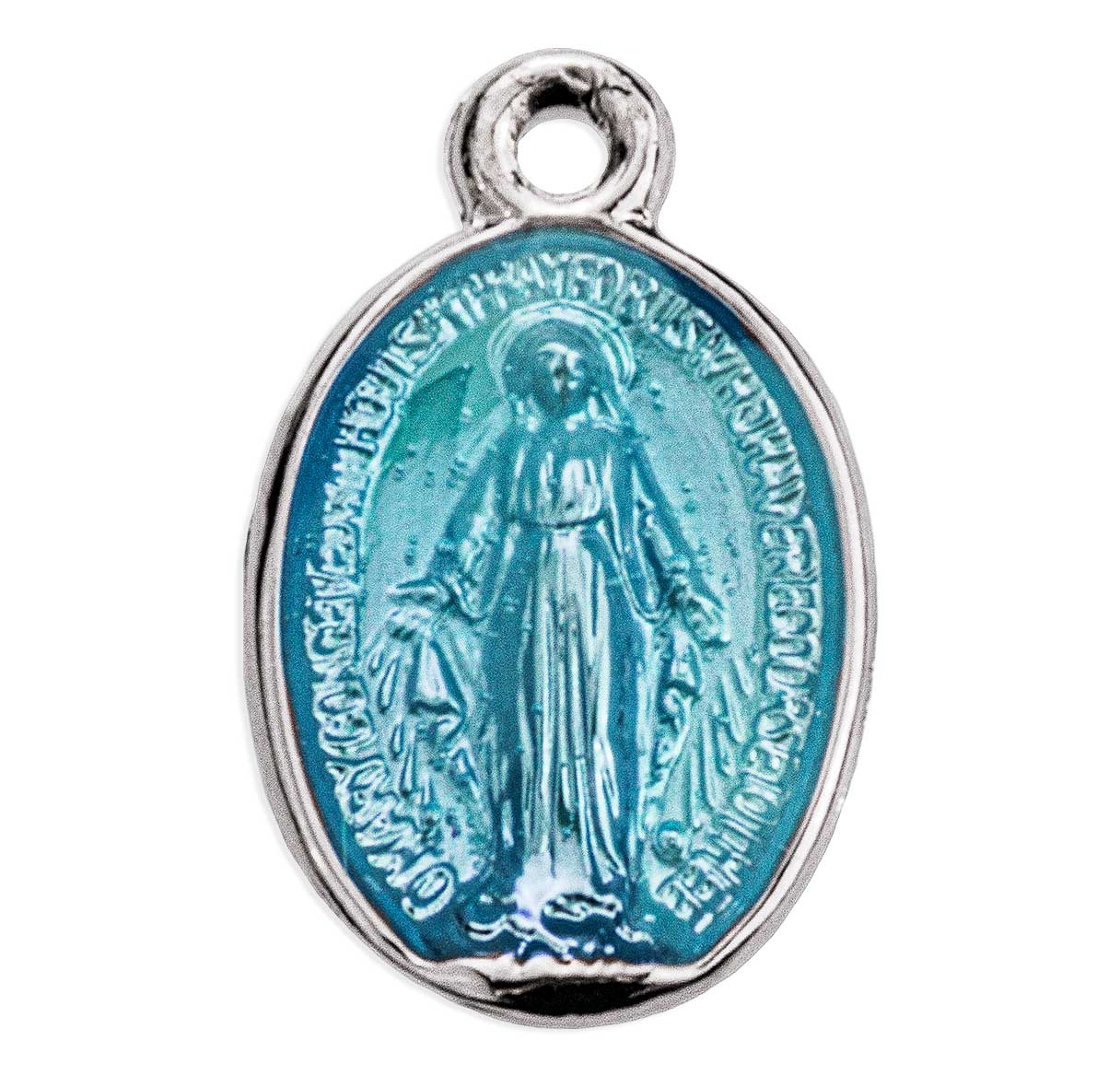 This 1/2-inch Sterling Silver Oval Blue Enamel Miraculous Medal with 13-inch Chain is made in the USA.