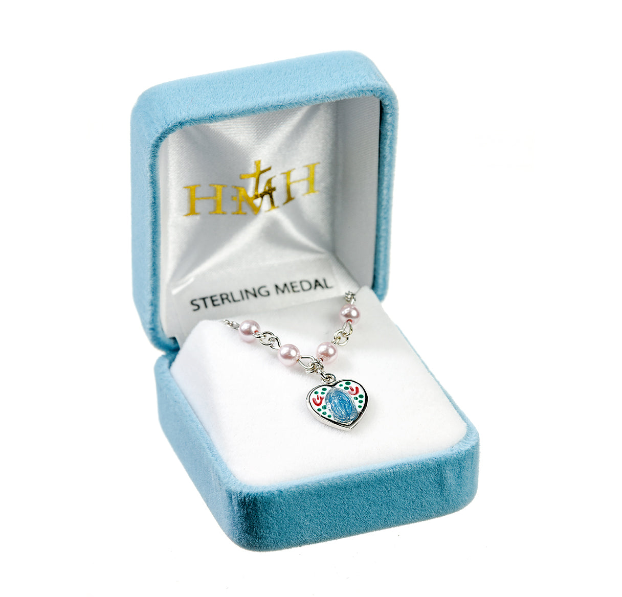 This 4mm Pink Finest Austrian Crystal Pearl Pendant with Sterling Silver Enameled Heart Miraculous Medal 18-inch Chain is made in the USA.
