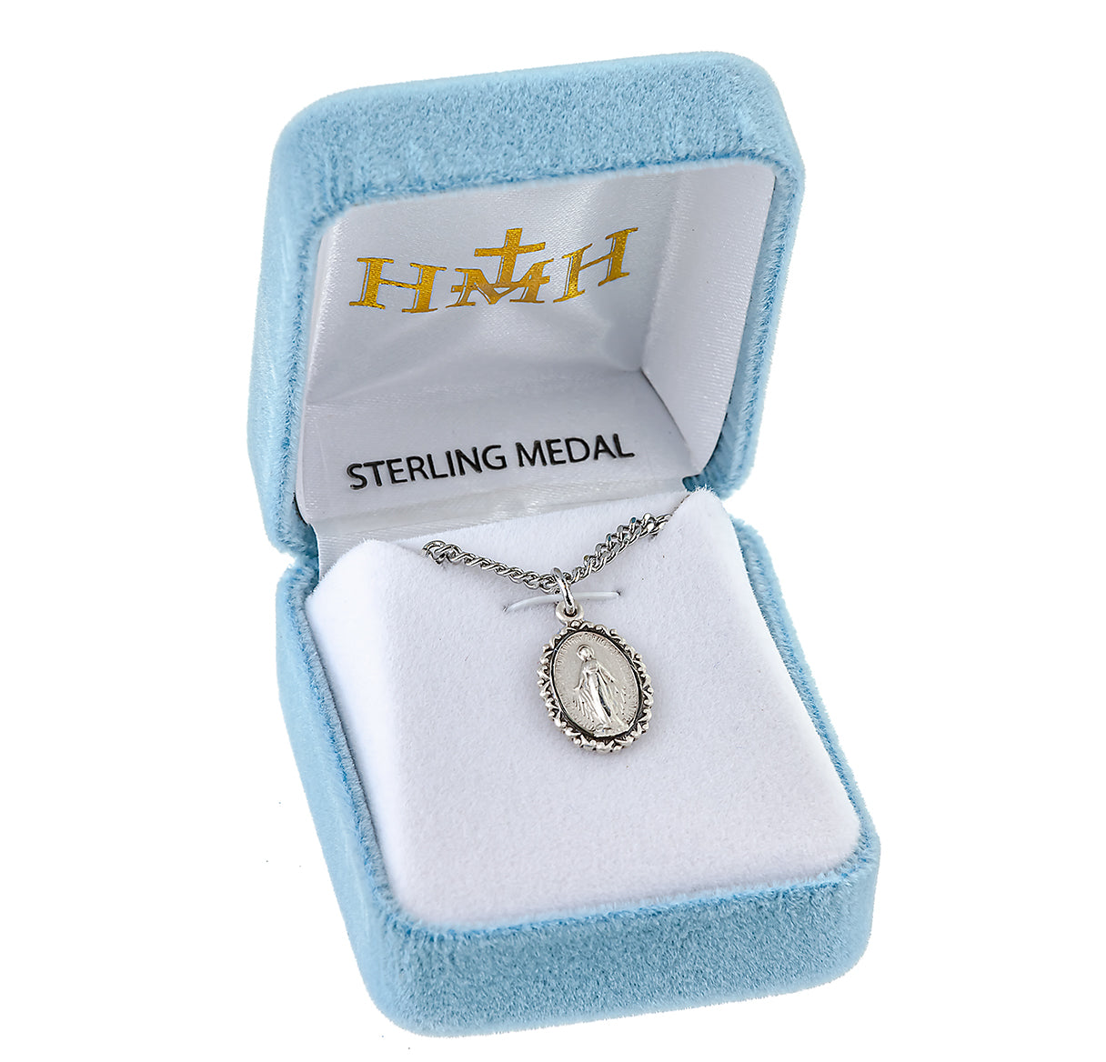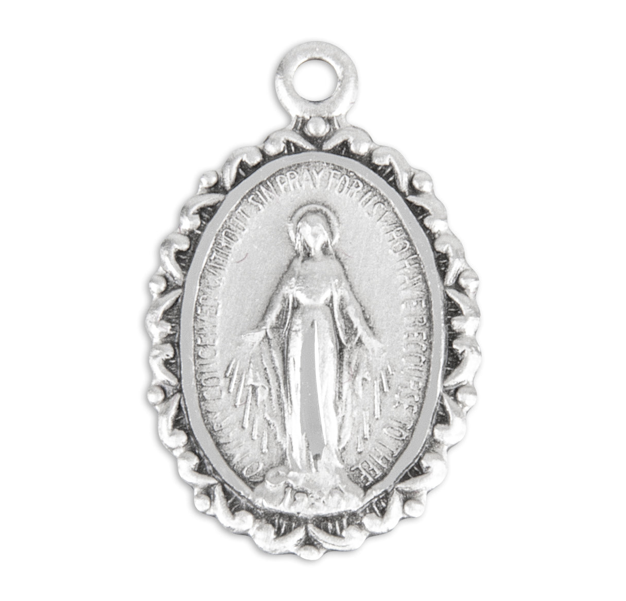 This 5/8-inch Sterling Silver Oval Miraculous Medal with 13-inch Chain is made in the USA.