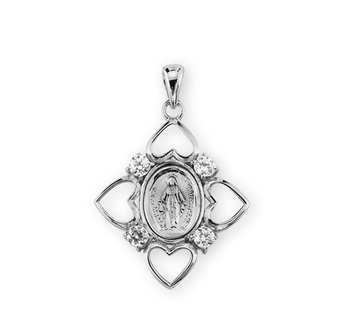 1.5-inch Sterling Silver Miraculous Medal, made in the USA. The Traditional Shape Medal is Set in a 4 Heart Frame with 4 Finest Austrian Crystal Clear Set Cubic Zircons Embellished Rays of Light around Fancy Border is Adorned with finely detailed Blessed Mother Mary with rays coming out of her extended hands. The Reverse Side of the Medal Portrays an "M" with a Cross on the top and the "Sacred Hearts" underneath surrounded by Twelve Stars.