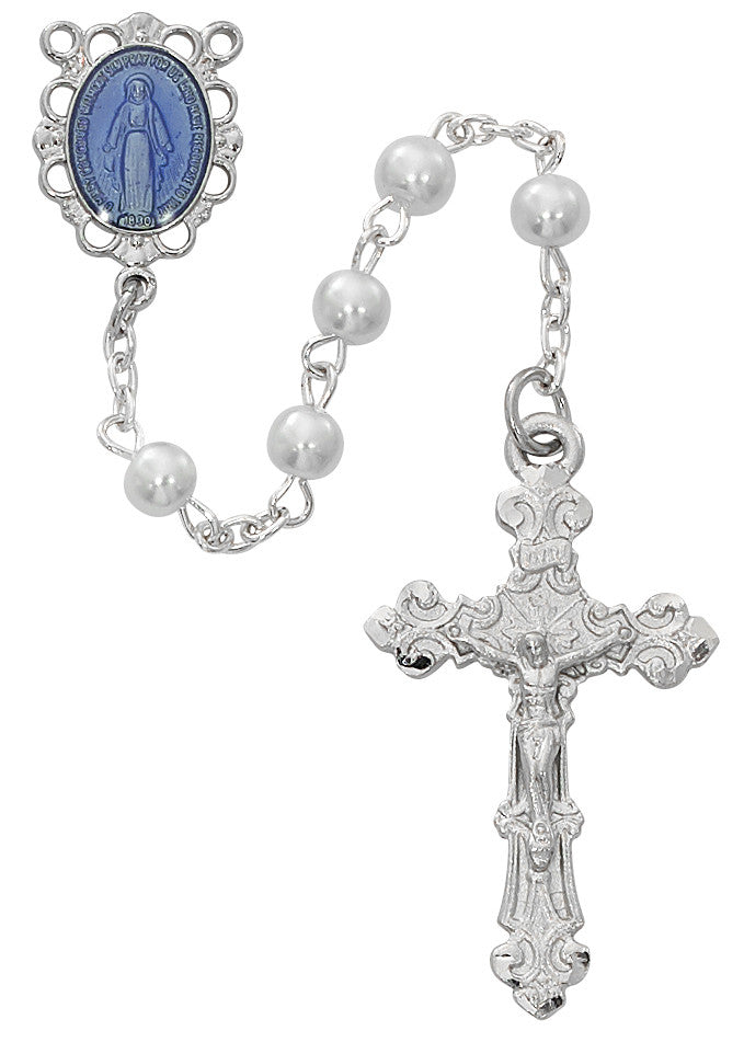 This white glass rosary with blue accents features a beautiful Miraculous Medal centerpiece, honoring Our Lady's appearance to St. Catherine Labouré in 1830. Crafted by McVan, a trusted name in Catholic devotional items, each bead is made of smooth glass that catches the light as you pray. The pewter crucifix and center add durability and traditional elegance to this meaningful devotional piece.