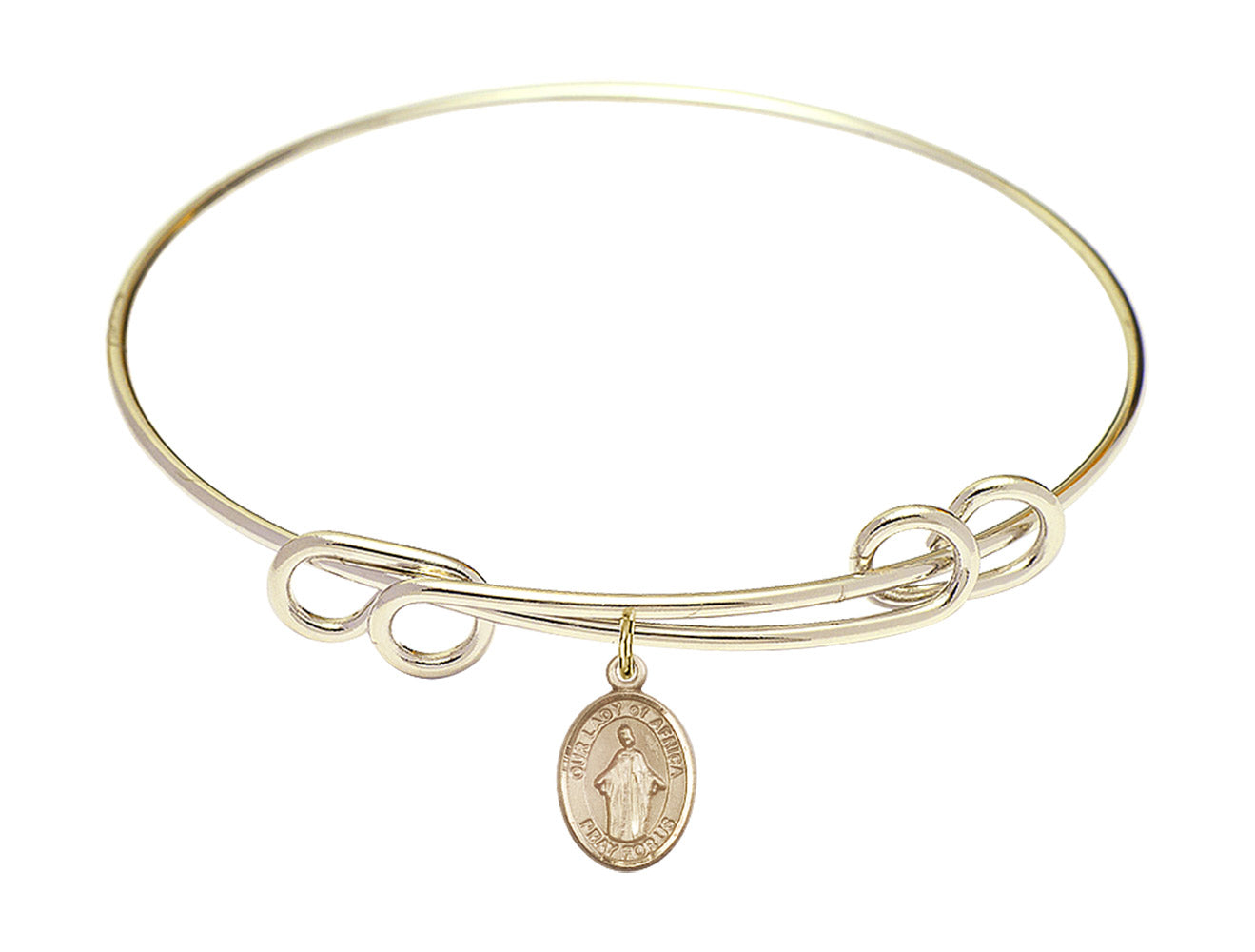 Our 8 1/2 inch Round Double Loop Hamilton Gold Bangle Bracelet with a 14kt Gold Filled Our Lady of Africa charm. is proudly manufactured in the USA.