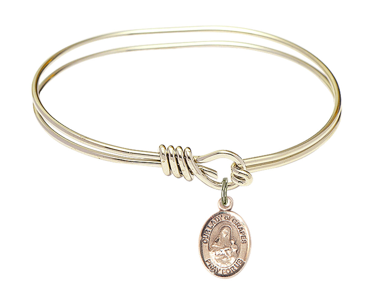 Our 5 3/4 inch Oval Eye Hook Hamilton Gold Bangle Bracelet with a 14kt Gold Filled Our Lady of Grapes charm. is proudly manufactured in the USA.