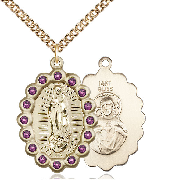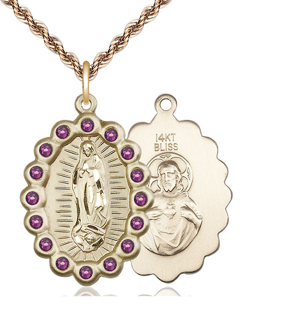 14kt Gold Our Lady of Guadalupe Medal with Amethyst Swarovski stones | Large