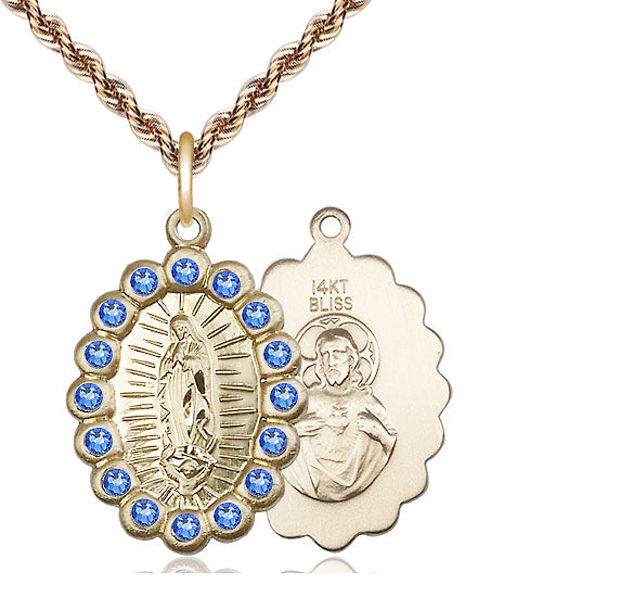 14kt Gold Our Lady of Guadalupe Medal with Sapphire Swarovski stones | Medium