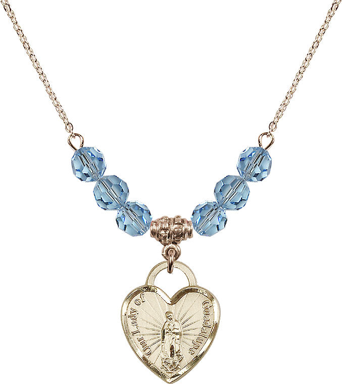 Gold-Plated Necklace with 4mm Aqua Crystal Beads & 14K-Filled Our Lady Guadalupe Heart / Recuerdo Medal