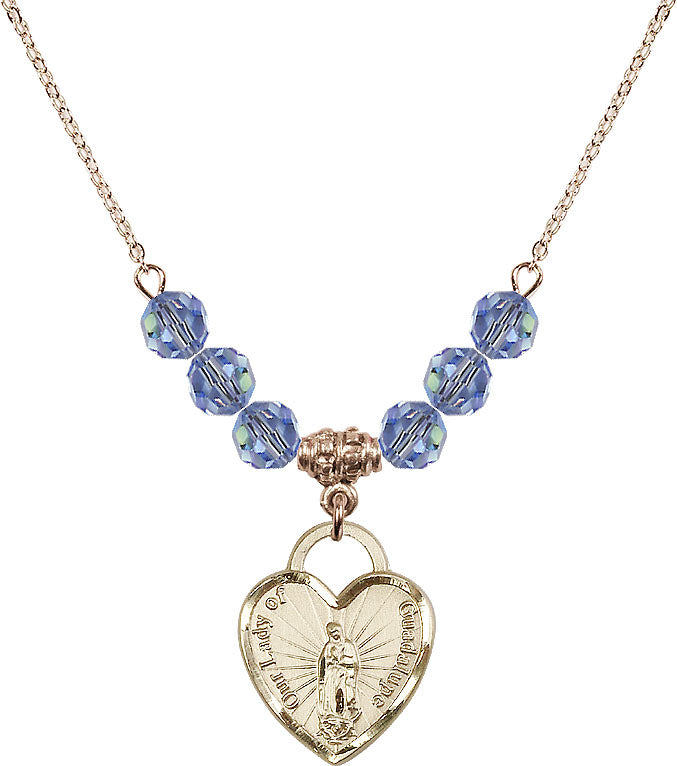 Gold-Plated Necklace with 4mm Light Sapphire Crystal Beads & 14K-Filled Our Lady Guadalupe Heart / Recuerdo Medal