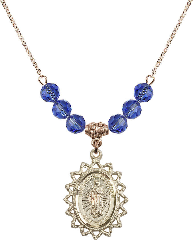 Gold-Plated Necklace with 4mm Sapphire Crystal Beads & 14K-Filled Our Lady of Guadalupe Medal