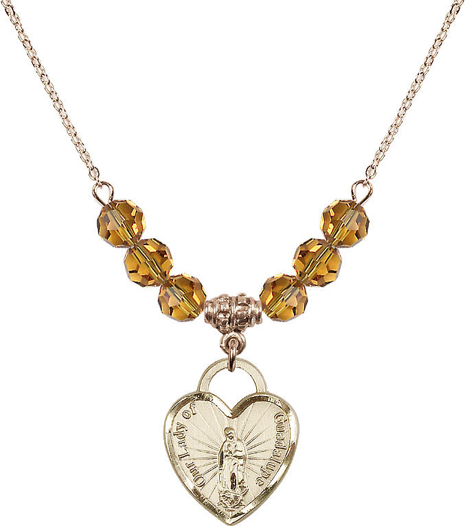 Gold-Plated Necklace with 4mm Topaz Crystal Beads & 14K-Filled Our Lady Guadalupe Heart / Recuerdo Medal