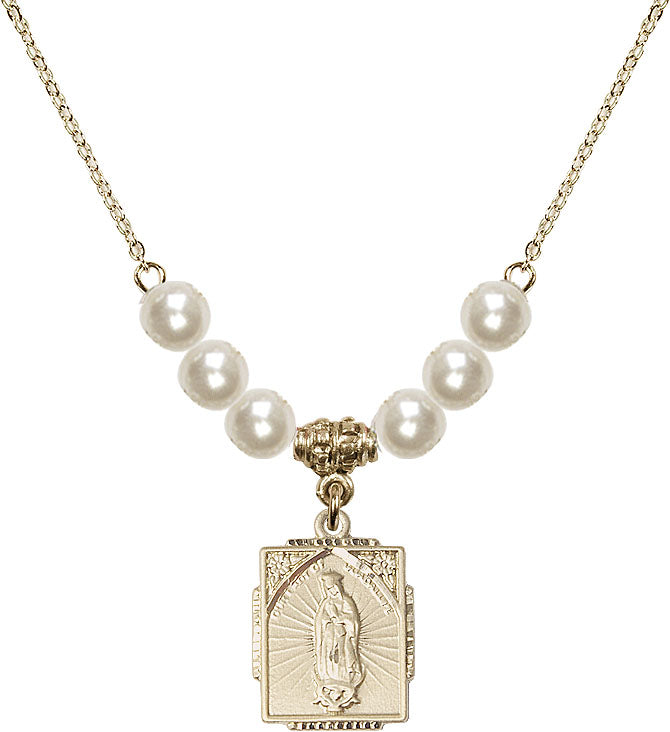 Our 18" Hamilton Gold Plated Necklace with 6mm Faux-Pearl Beads featuring a 14kt Gold Filled Our Lady of Guadalupe Medal. is proudly manufactured in the USA.