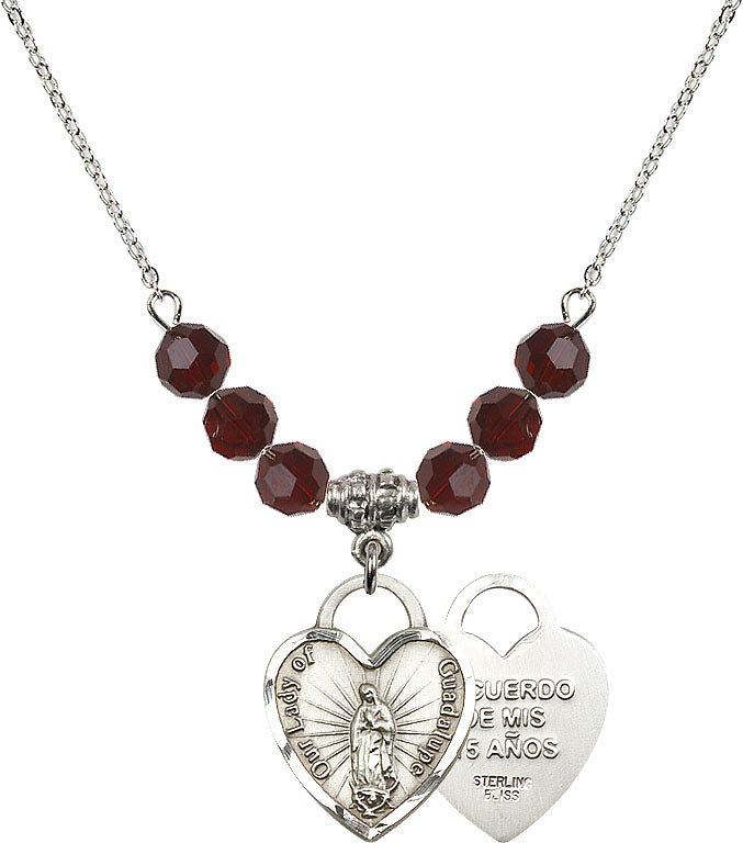 Our 18" Rhodium Plated Necklace with 4mm Garnet Crystal Beads featuring a Sterling Silver Our Lady Guadalupe Heart / Recuerdo Medal. is proudly manufactured in the USA.