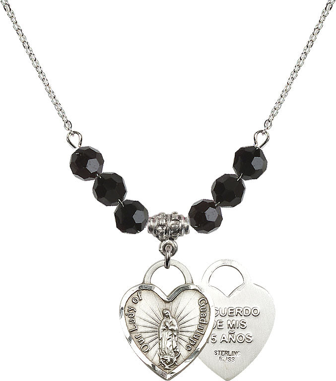 Necklace with 4mm Jet Crystal Beads & Sterling Our Lady Guadalupe Heart / Recuerdo Medal