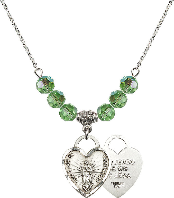 Necklace with 4mm Peridot Crystal Beads & Sterling Our Lady Guadalupe Heart / Recuerdo Medal