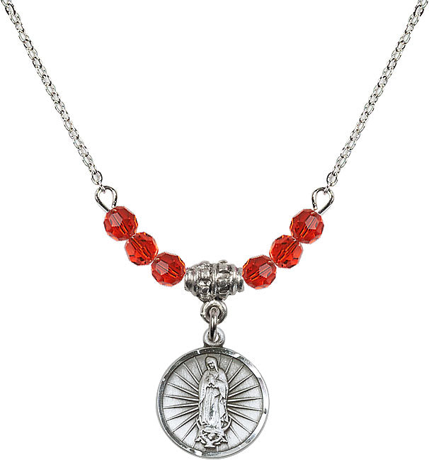 Our 18" Rhodium Plated Necklace with 4mm Ruby Crystal Beads featuring a Sterling Silver Our Lady of Guadalupe Medal. is proudly manufactured in the USA.