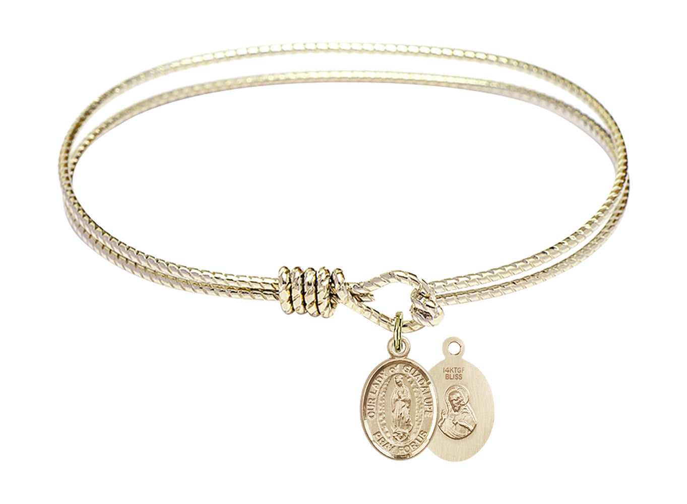 Our 7 1/4 inch Oval Eye Hook Hamilton Gold Bangle Bracelet with a 14kt Gold Filled Our Lady of Guadalupe charm. is proudly manufactured in the USA.