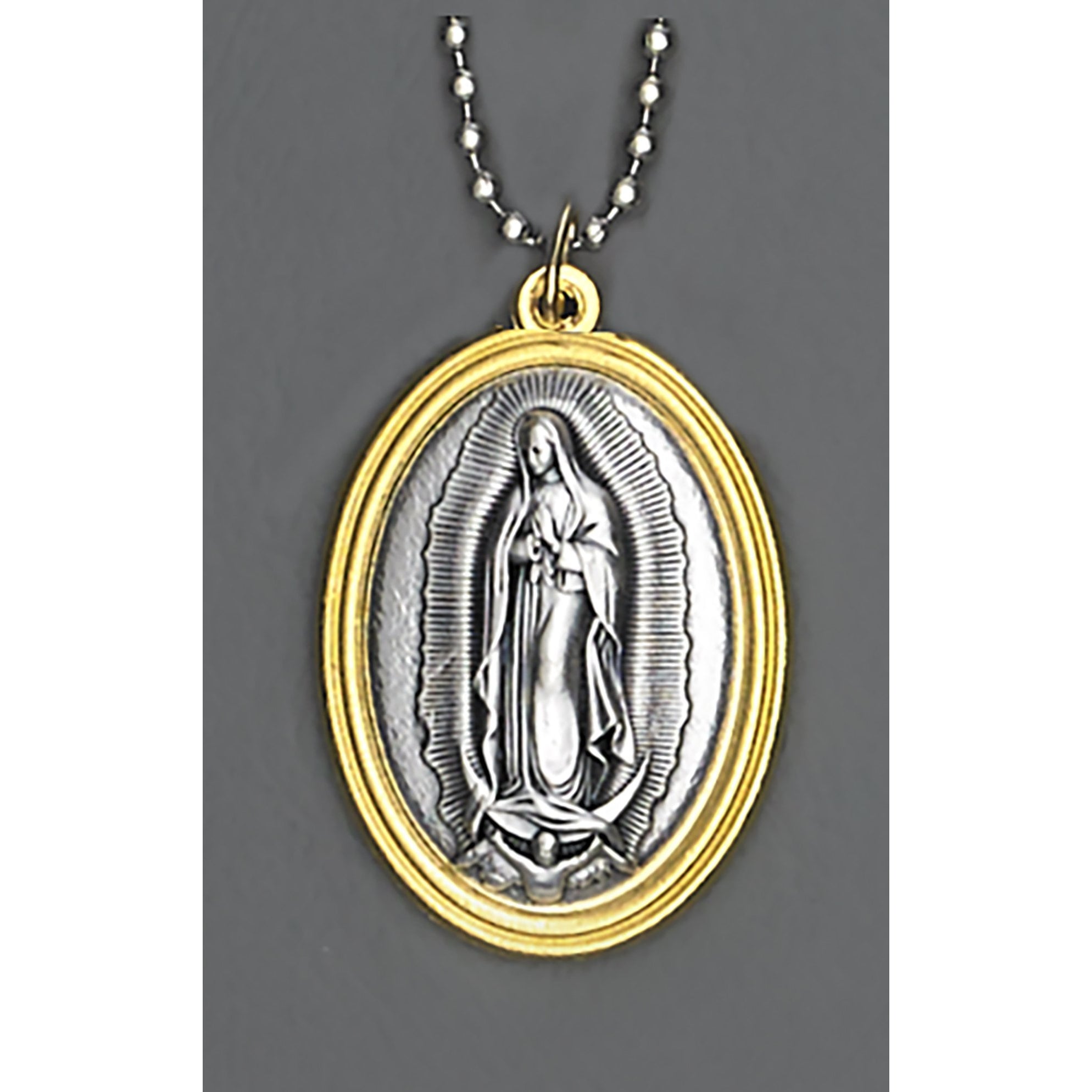 This six-pack of two-tone Our Lady of Guadalupe medals offers beautiful devotional pieces perfect for gifts, ministry, or group events. Each 1.5-inch medal features the beloved image of Our Lady of Guadalupe in elegant two-tone metal finish, capturing her gentle presence as she appeared to Saint Juan Diego in 1531. The medals come ready to wear on 8-inch ball chains, making them ideal for car mirrors, bags, or personal devotion.